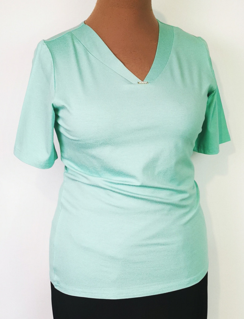 "V" nyakú, rövid ujjú, almazöld színű, nyaknál díszített, pamutos anyagú felső. 6-7 cm-t enged.