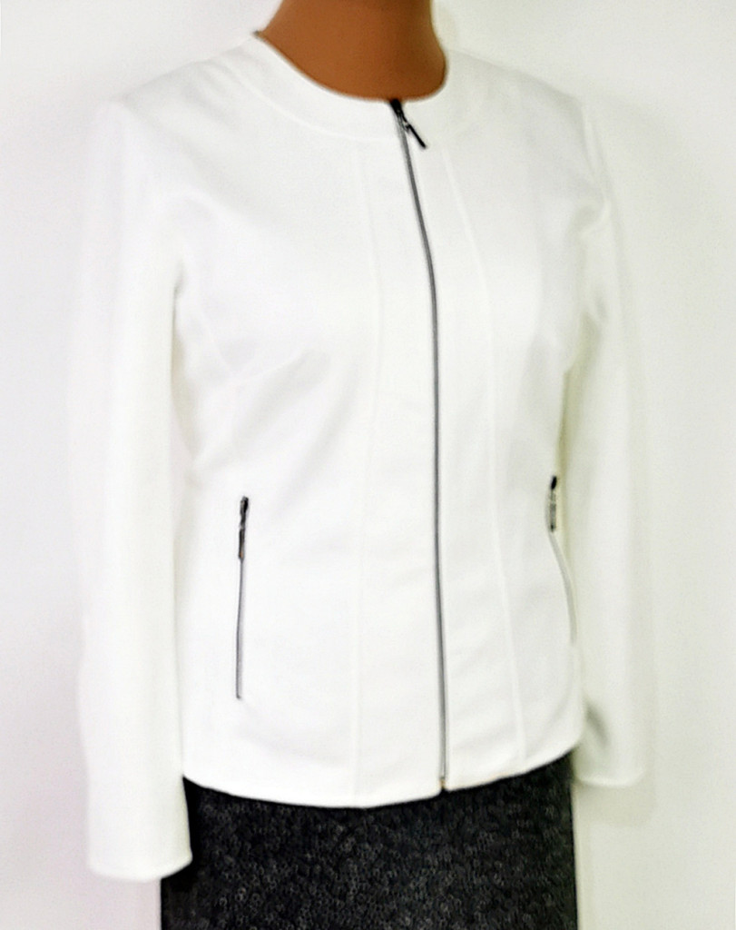 Kerek nyakú, hosszú ujjú, cipzáras, álzsebes, bársonyos tapintású anyagú, fehér színű alkalmi blézer. 2-3 cm-t enged.