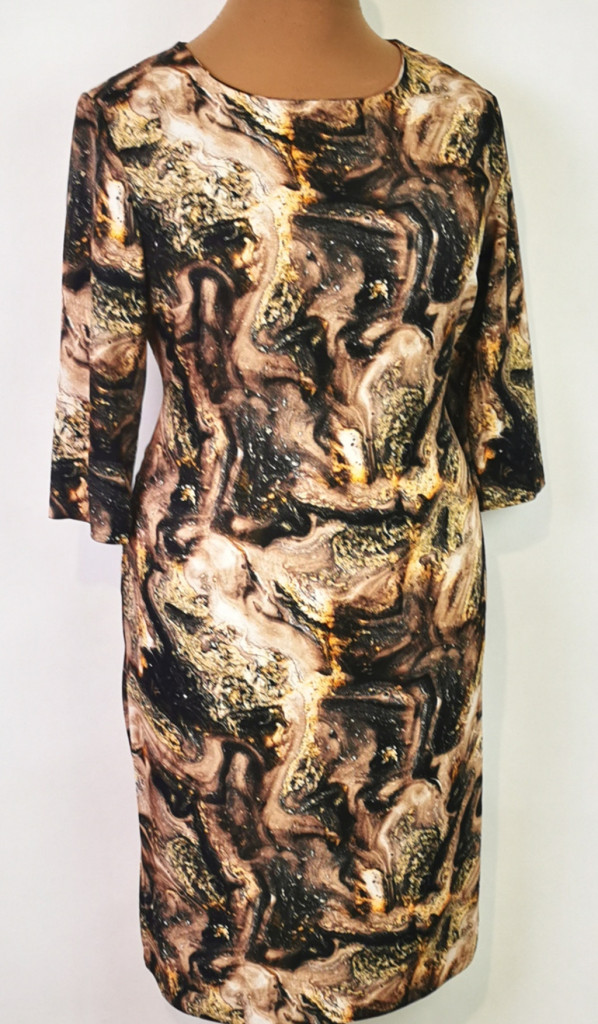 Kerek nyakú, 3/4-es ujjú, bézs-barna-sötétbarna színű mintával díszített, hátul derékig cipzáras, kellemes, pamutos anyagú ruha. 6-7 cm-t enged.