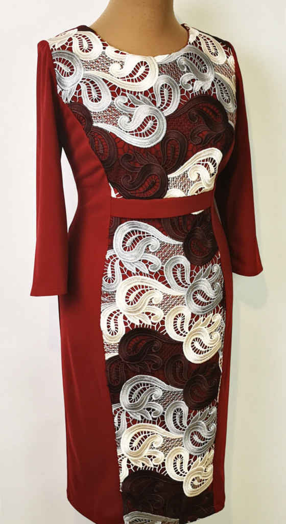 Gyönyörű bordó alapszínű, hátul derékig cipzáras, felsliccelt, felső része elől bézs-szürke-bordó színű csipkerátéttel díszített, kellemes, selymes anyagú alkalmi ruha. 3-4 cm-t enged.