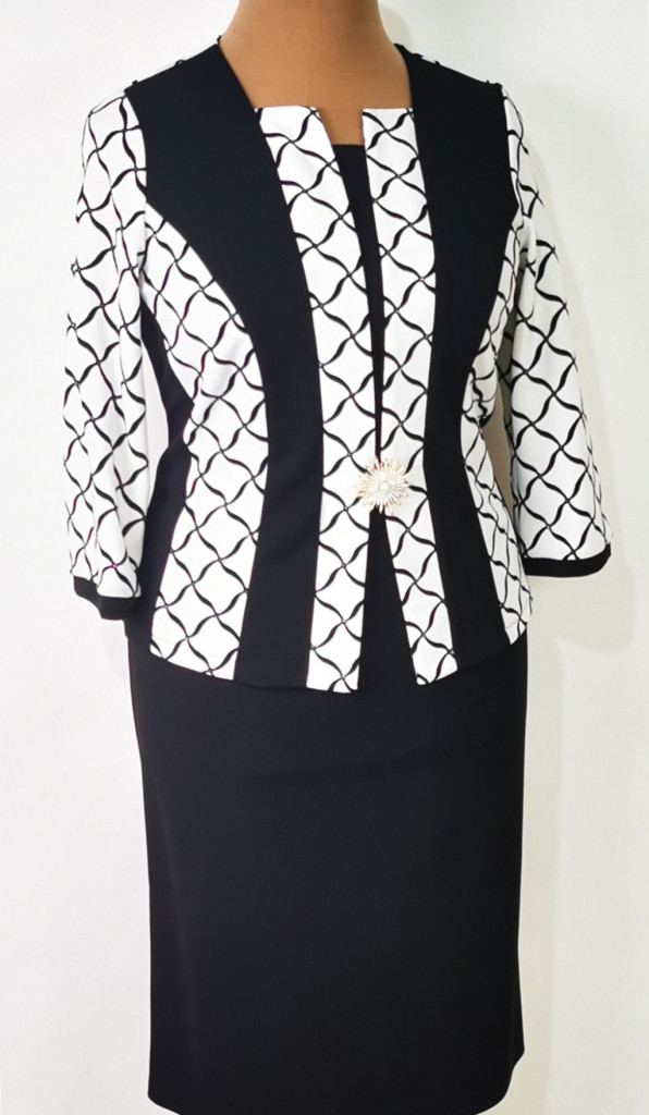 Csinos nyakú, 3/4-es ujjú, fekete alapon, fehér színű mintával díszített, selymes anyagú ruha, ajándék brossal. 5-6 cm-t enged.