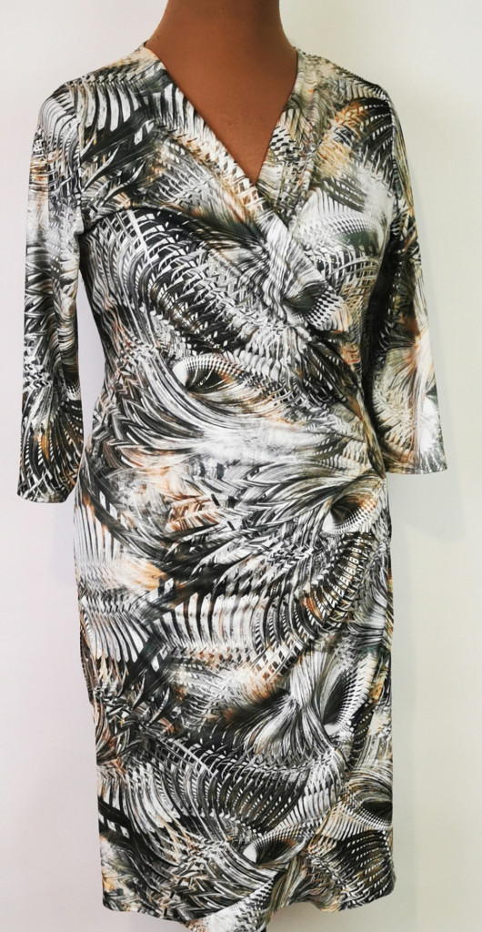 "V" nyakú, 3/4-es ujjú, világoszöld-sötétzöld-fehér színű mintás, átlapolt hatású, deréknál ráncolt, átlapolt hatású, selymes rugalmas anyagú, alkalmi ruha. 2-3 cm-t enged.