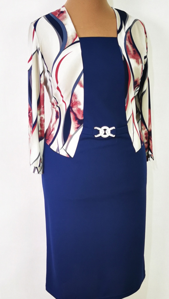 Sötétkék alapszínű, felső része, fehér-kék-bordó színű mintával díszített, deréknál díszcsatos ruha. 5-6 cm-t enged.