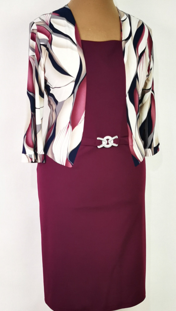 Mélybordó alapszínű, felső része, fehér alapon színes mintával díszített, deréknál díszcsatos ruha. 5-6 cm-t enged.