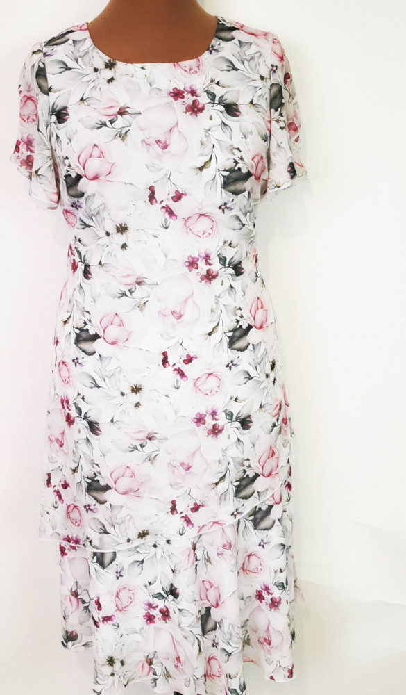 Kerek nyakú, lepke ujjú, dupla anyagú, fehér alapon színes virág mintás, alkalmi muszlin ruha. 1-2 cm-t enged.