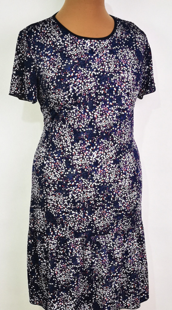 Elől-hátul sötétkék alapon, apró fehér-rózsaszín színű mintával díszített, alkalmi ruha. 1-2 cm-t enged.