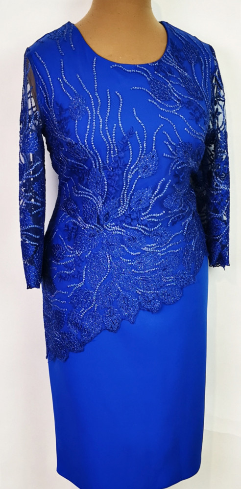 Kerek nyakú, 3/4-es ujjú, hátul cipzáras, felsliccelt, királykék színű, hátul egyszínű, elől hímzett csipke rátéttel díszített alkalmi ruha. 2-3 cm-t enged.