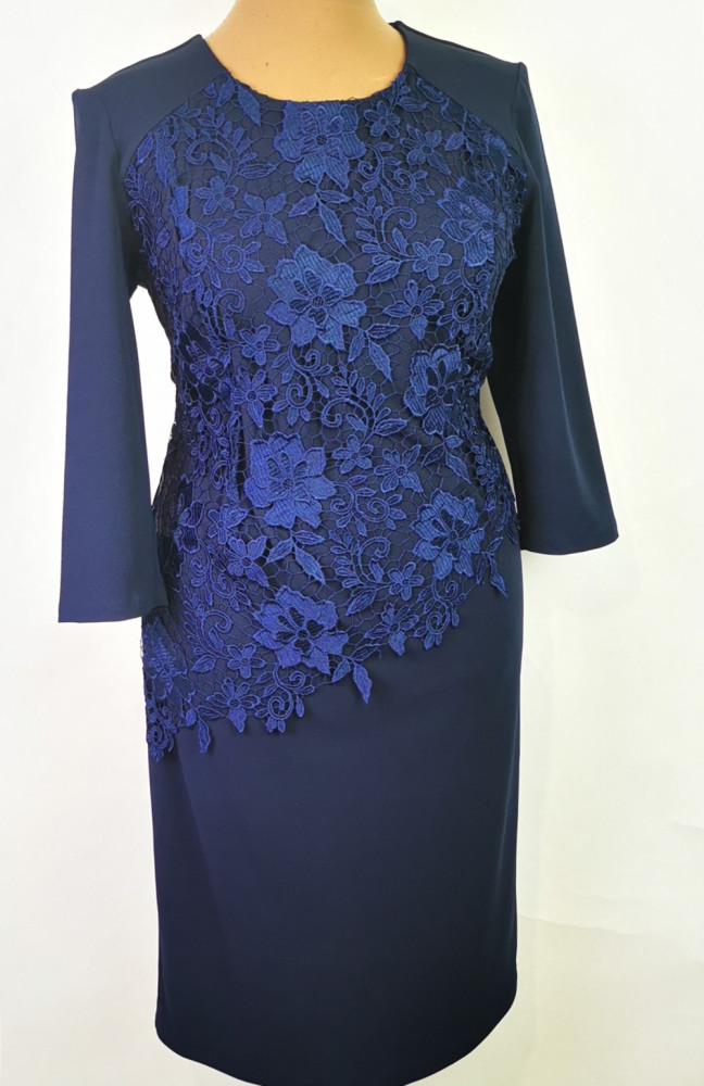 Kerek nyakú, 3/4-es ujjú, sötétkék színű, hátul derékig cipzáras, felsliccelt, elől hímzett mintával díszített, betétes alkalmi ruha 3-4 cm-t enged.