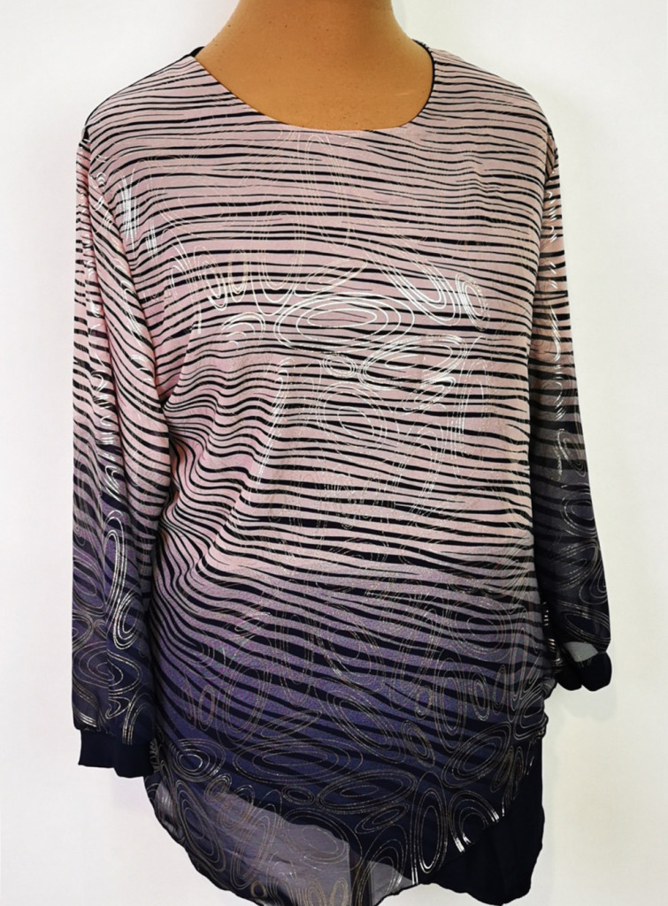 Kerek nyakú, 3/4-es muszlin ujjú, hátul egyszínű sötétkék, elől sötétkék-rózsaszín, muszlin betéttel díszített felső. 2-3 cm-t enged.
