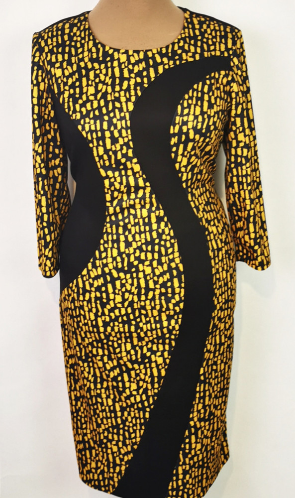 Kerek nyakú, 3/4-es ujjú, hátul egyszínű fekete, első részén fekete betéttel díszített, hátul cipzáras, felsliccelt, selymes, rugalmas anyagú ruha. 5-6 cm-t enged.