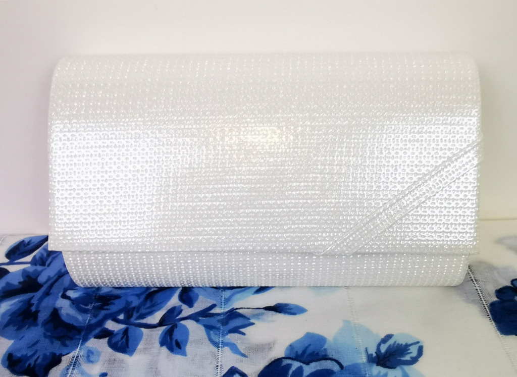 Ezüst színű, egy rekeszes, vállra is akasztható alkalmi kézi táska.