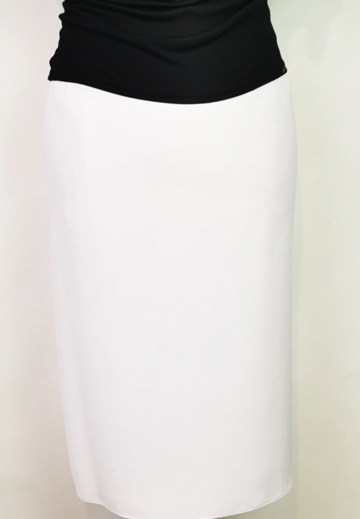 Fehér színű, selyembéléses, egyenes formájú, kétoldalt gumibetétes, hátul gombos, cipzáras alkalmi szoknya.