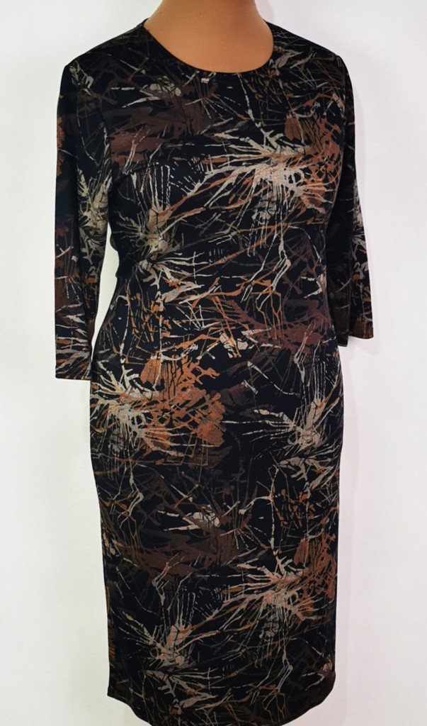 Kerek nyakú, 3/4-es ujjú, fekete alapon, Bézs-barna színű mintás, pamutos anyagú ruha. 4-5 cm-t enged.