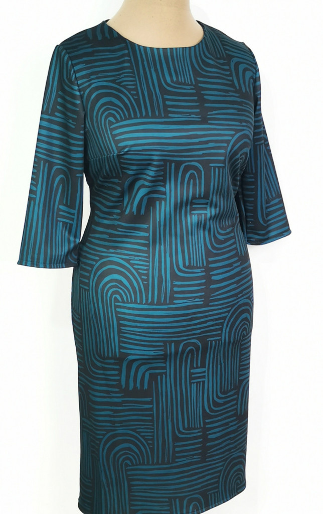 Fekete alapon, zöld színű mintával díszített, kerek nyakú, 3/4-es ujjú, hátul cipzáras ruha. 1-2 cm-t enged.