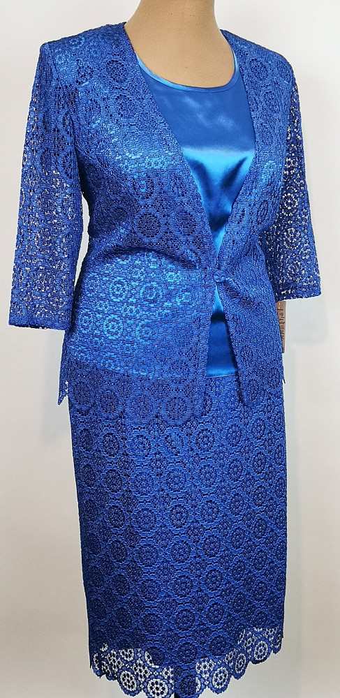 Három részes alkalmi kosztüm, szoknya része selyem béléses, cipzáras, hátul felsliccelt, kétoldalán gumis, csipke rátétes, felső része kerek nyakú, rövid ujjú,selyem anyagú