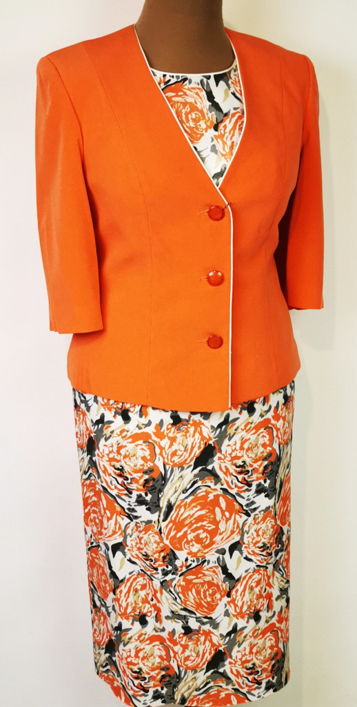 Gyönyörű három részes alkalmi kosztüm, szoknya része selyem béléses, gombos, cipzáras, kétoldalt gumibetétes. Felső része kerek nyakú, rövid ujjú, hátul cipzáras. A szoknya és felső fehér alapon, narancs-szürke színű mintával díszítve. Blézere "V" nyakú, 3/4-es ujjú, selyembéléses. 1-2 cm-t enged.