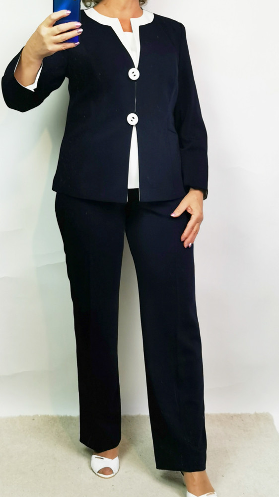 Gyönyörű, sötétkék színű, három részes alkalmi nadrág kosztüm. Nadrágja gombos, cipzáras záródású, selymes anyagú. Felső része fehér színű, kerek nyakú, rövid ujjú, oldalt cipzáras. Blézere két gombos, selyembéléses, hosszú ujjú. 1-2 cm-t enged.