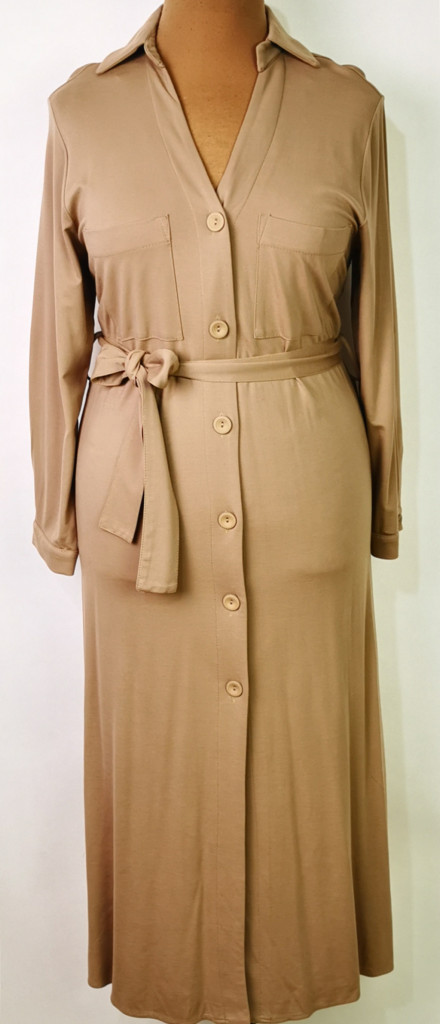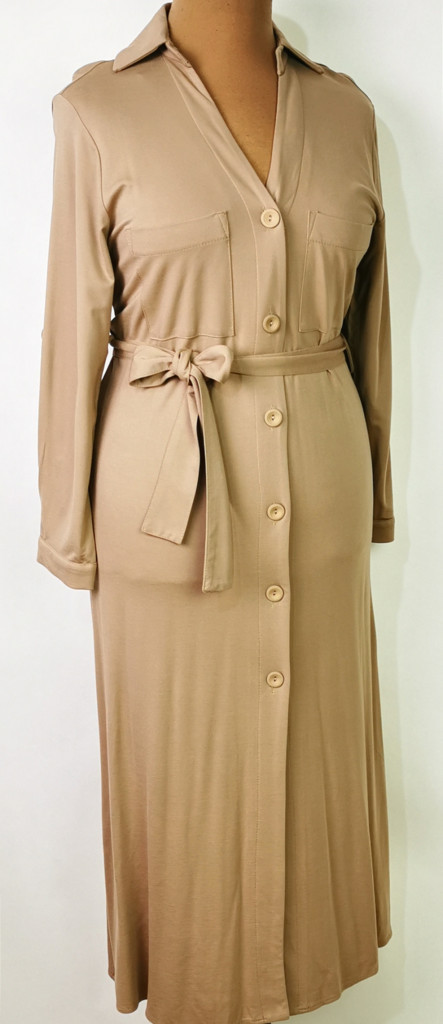 Ingnyakú, hosszú, roll-upos ujjú, végég gombos, zsebes, öves, pamutos anyagú, maxi alkalmi ruha 42-52