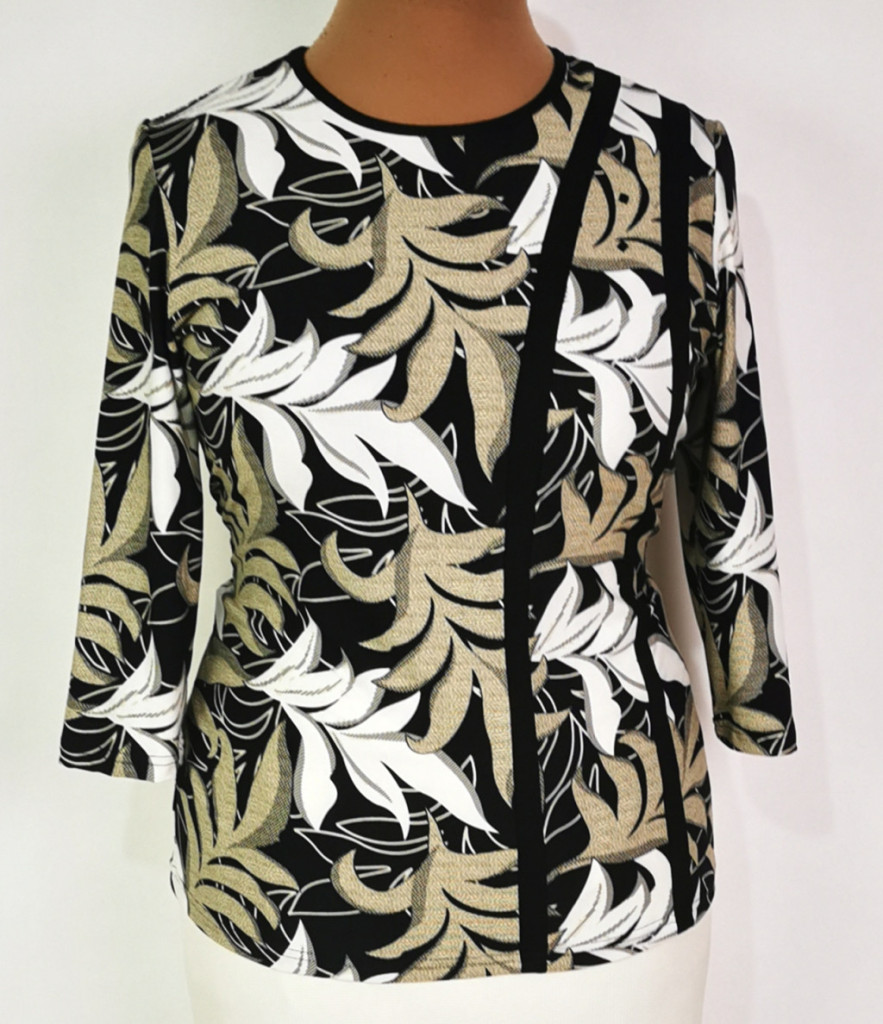 Kerek nyakú, 3/4-es ujjú, fehér-bézs-fekete színű mintás, pamutos anyagú felső. 5-6 cm-t enged.