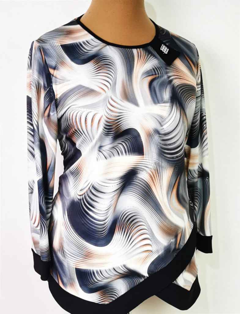 Kerek nyakú, 3/4-es ujjú, színes mintás,nyaknál díszített felső. 3-4 cm-t enged.