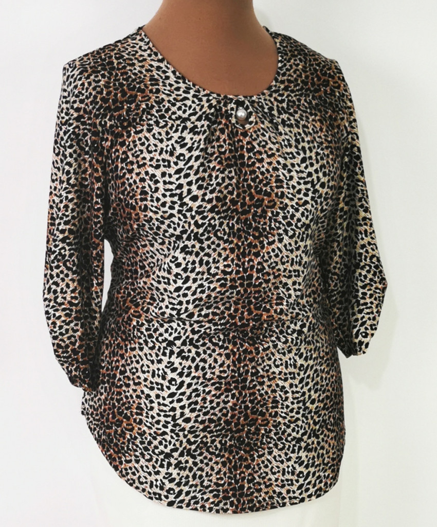 Kerek nyakú, 3/4-es ujjú, világosbarna-sötétbarna színű, leopárd mintás, nyaknál díszített felső. 5-6 cm-t enged.