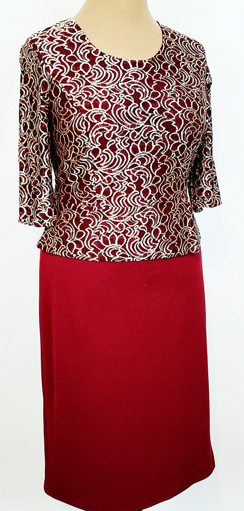 Kerek nyakú, 3/4-es csipke ujjú, bordó alapszínű, felső része elől-hátul bordó alapszínen,aranyszínű, csipke díszítéses, kellemes, selymes anyagú alkalmi ruha. 3-4 cm-t enged.