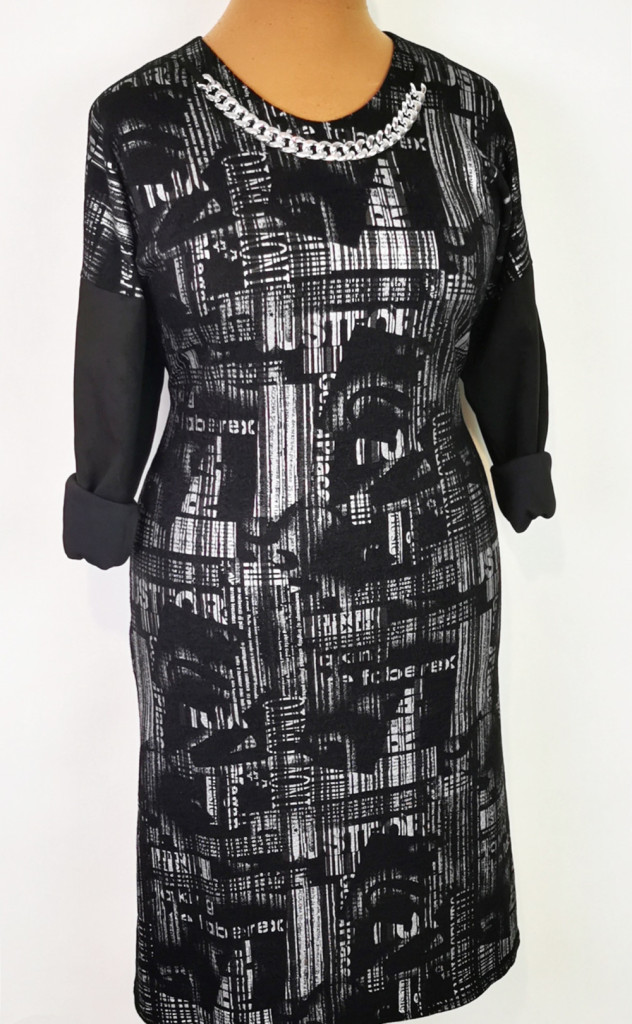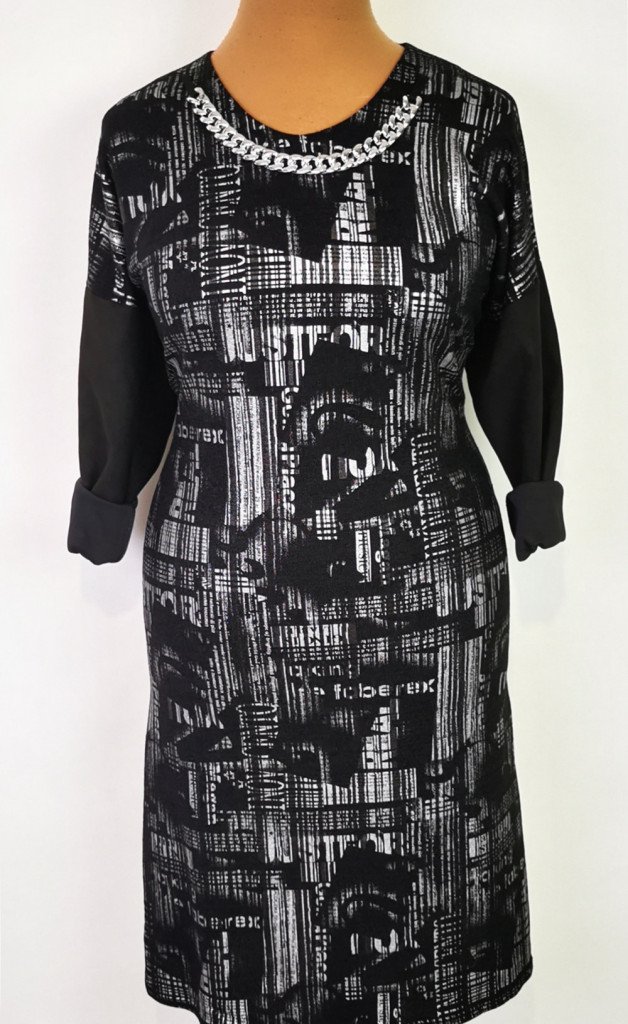 Kerek nyakú, hosszú ujjú, fekete alapon, szürke mintás, pamutos anyagú ruha. 4-5 cm-t enged.