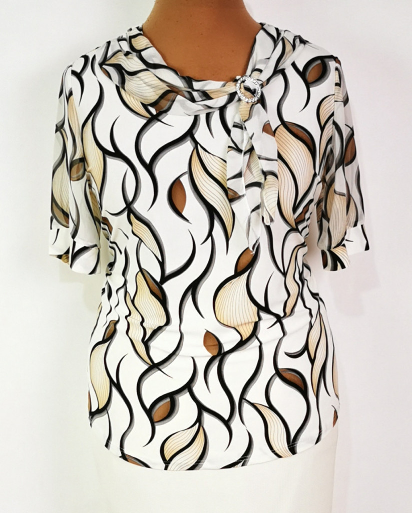 Kerek nyakú,rövid ujjú, nyaknál díszített, fehér alapon, bézs-barna-feketek színű mintás, selymes rugalmas anyagú felső. 5-6 cm-t enged.