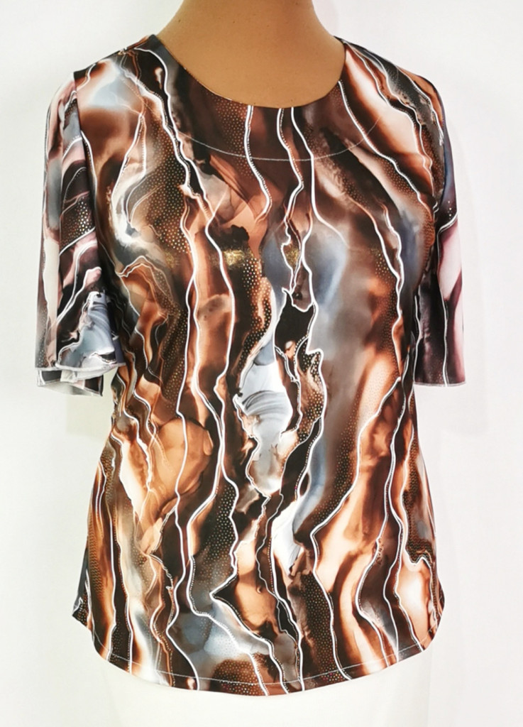 Kerek nyakú, rövid ujjú, világosbarna-sötétbarna-szürke színű, mintás, selymes anyagú felső. 1-2 cm-t enged.
