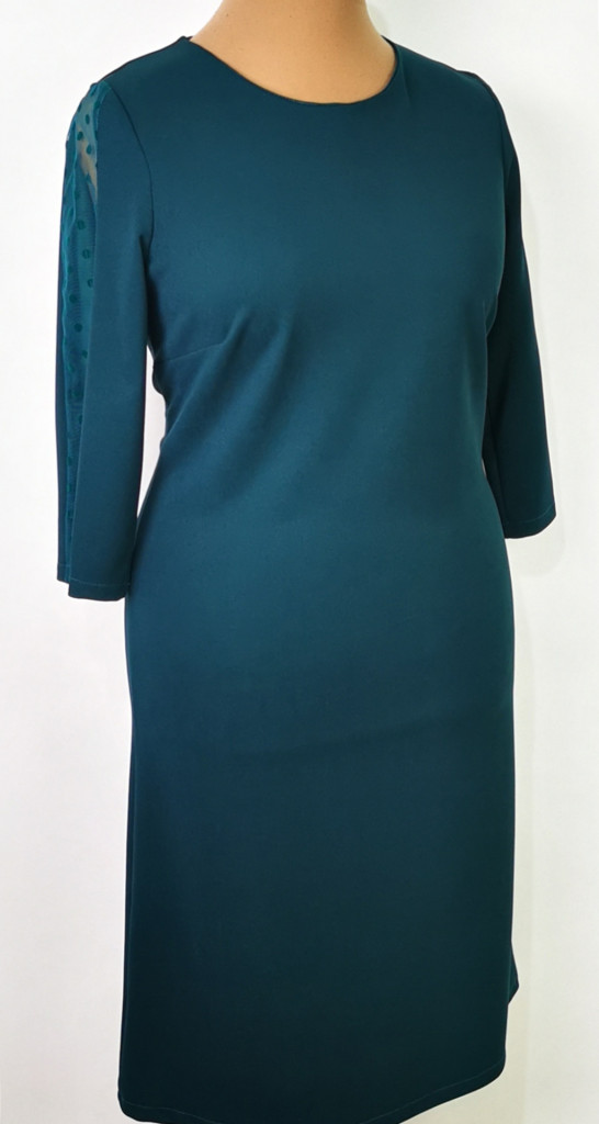 Kerek nyakú, sötétzöld színű, 3/4-es tüllbetétes ujjú, hátul cipzáras, felsliccelt, alkalmi ruha. 1-2 cm-t enged.