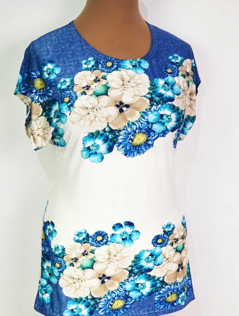 Kerek nyakú, ujjatlan, fehér alapon, farmerkék-bézs színű, selymes anyagú felső. 5-6 cm-t enged.