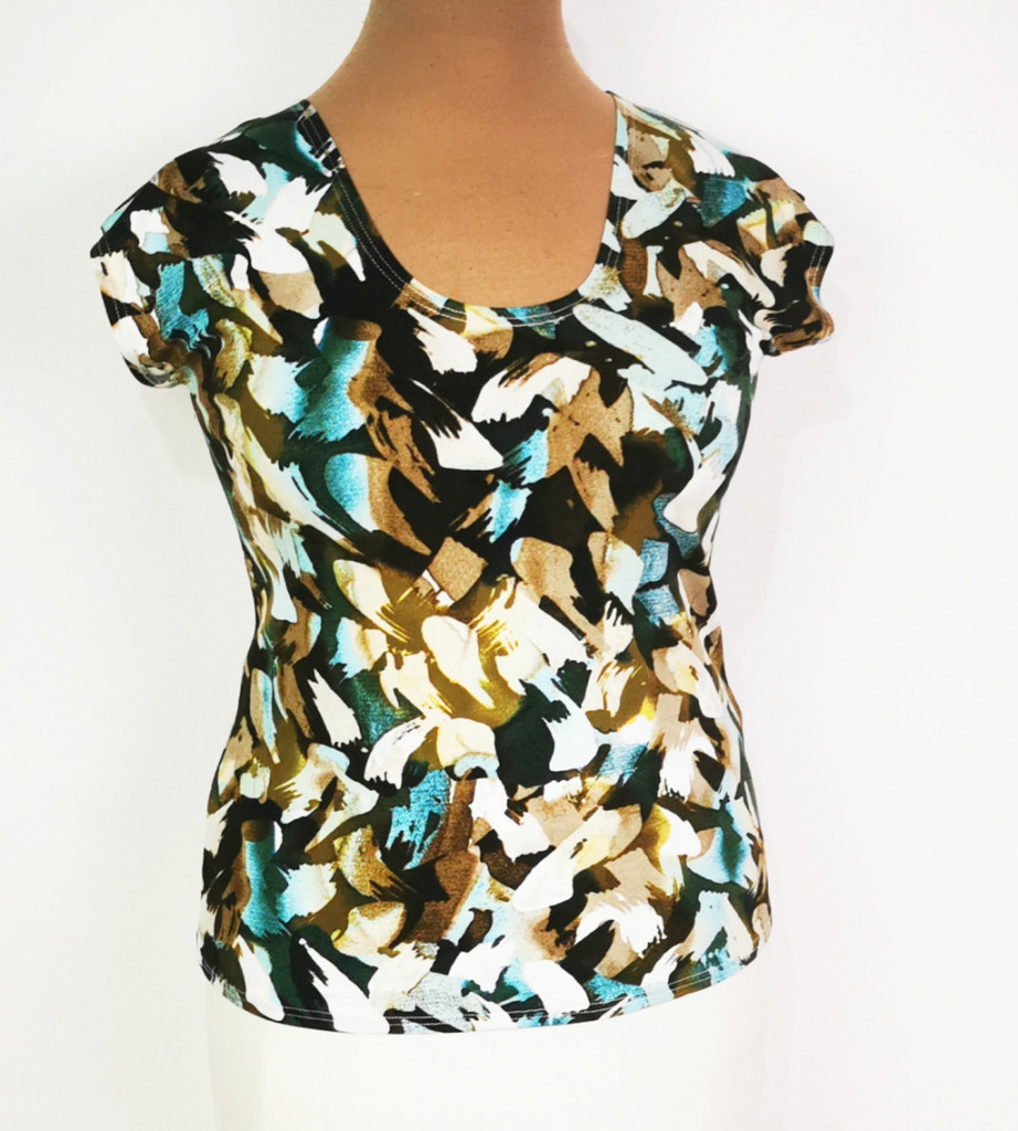 Kerek nyakú, ujjatlan, fehér-kék-barna-fekete színű, apmutos anyagú felső. 2-3 cm-t enged.