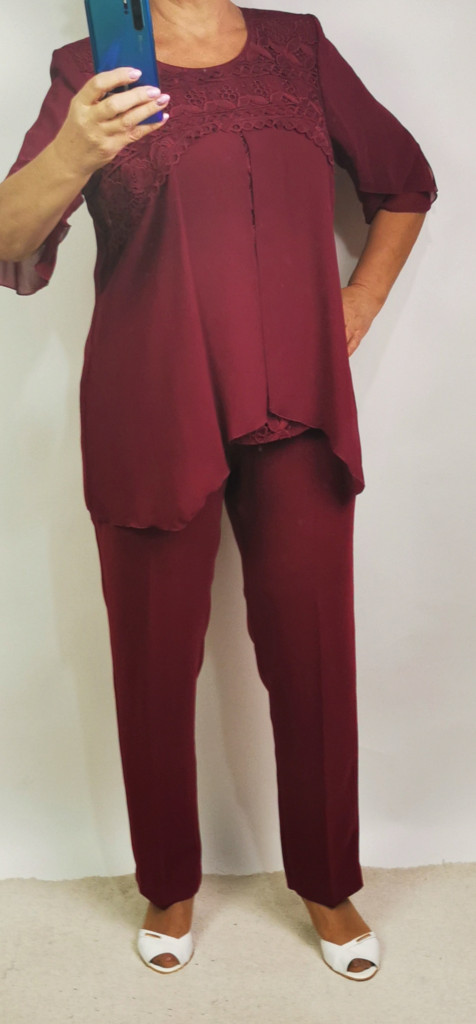 Gyönyörű, bordó színű, két részes alkalmi kosztüm, nadrágja kétoldalt gumis, gombos, cipzáras záródású, zsebes. Felső része kerek nyakú, 3/4-es muszlin ujjú, aszimetrikus aljú, dupla muszlin anyagú, muszlin rátétes,