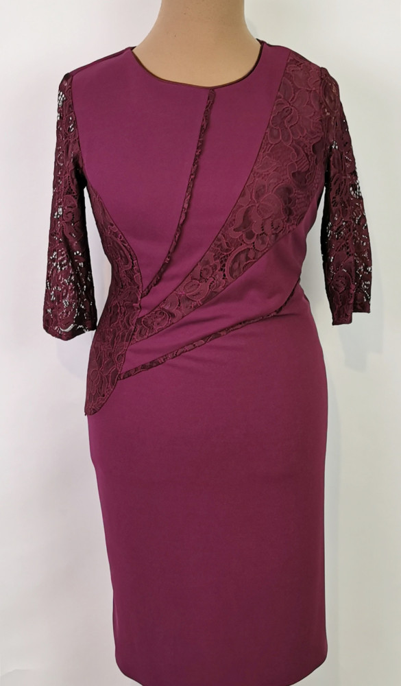 Kerek nyakú, csipke ujjú, lila színű, hátul felsliccelt, elől nagyon szép csipke betétes, karcsúsított, kellemes, selymes anyagú, alkalmi ruha. 5-6 cm-t enged.