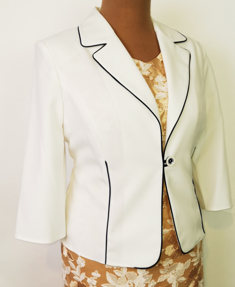 Nagyon szép, fehér, 3/4-es ujjú, egy díszgombos, fekete szegővel díszített alkalmi blézer 44-56