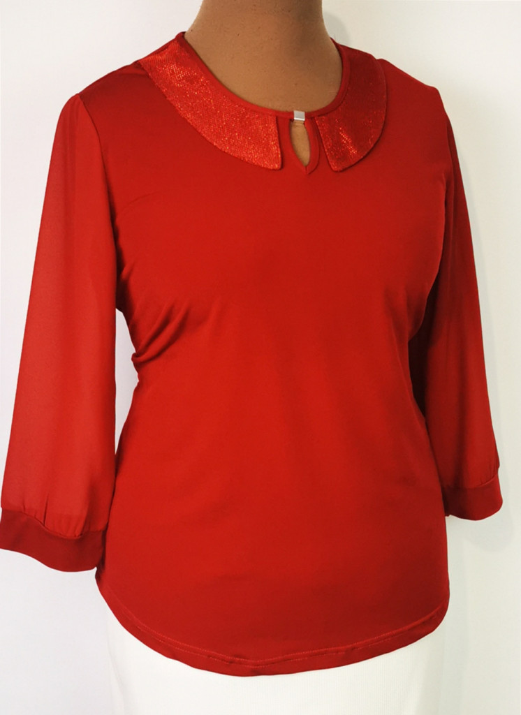 Piros színű, 3/4-es ujjú, nyaknál díszített, selymes anyagú alkalmi felső. 2-3 cm-t enged.