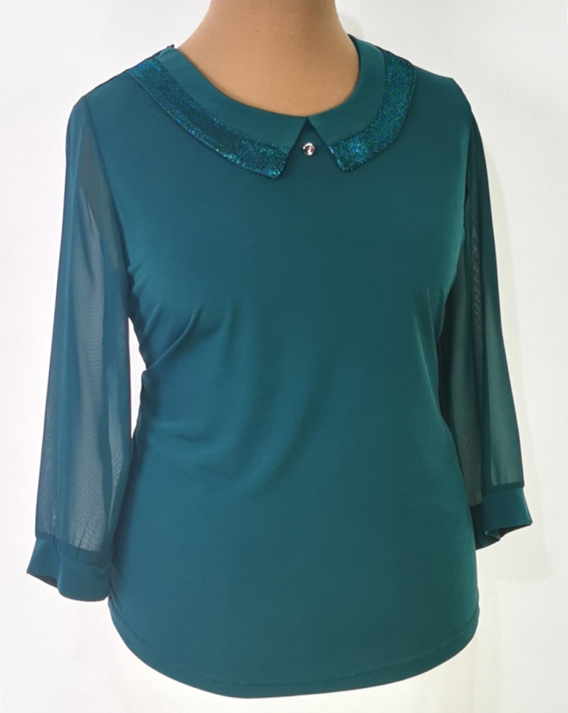 Zöld színű, 3/4-es ujjú, nyaknál díszített, selymes anyagú alkalmi felső. 2-3 cm-t enged.