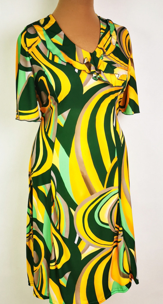 "V" nyakú, rövid ujjú, karcsúsitott, lefelé bővülő, nyaknál fodorral díszített,sárga-világoszöld-sötétzöld színű, selymes anyagú ruha. 2-3 cm-t enged.