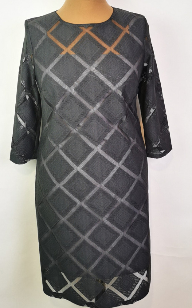 Nagyon szép, felső része nyomott kocka mintával díszített, kerek nyakú, 3/4-es ujjú, dupla anyagú, selyembéléses alkalmi ruha. 1-2 cm-t enged.