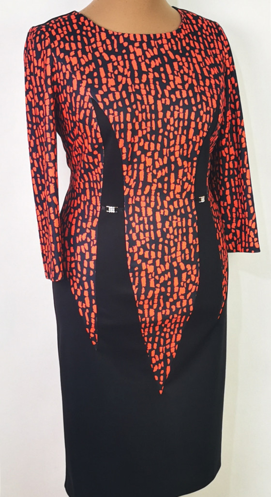 Kerek nyakú, 3/4-es ujjú, hátul derékig cipzáras, felsliccelt, hátsó része fekete, első része piros színű betéttel díszített, rugalmas, pamutos anyagú, alkalmi ruha. 4-5 cm-t enged.