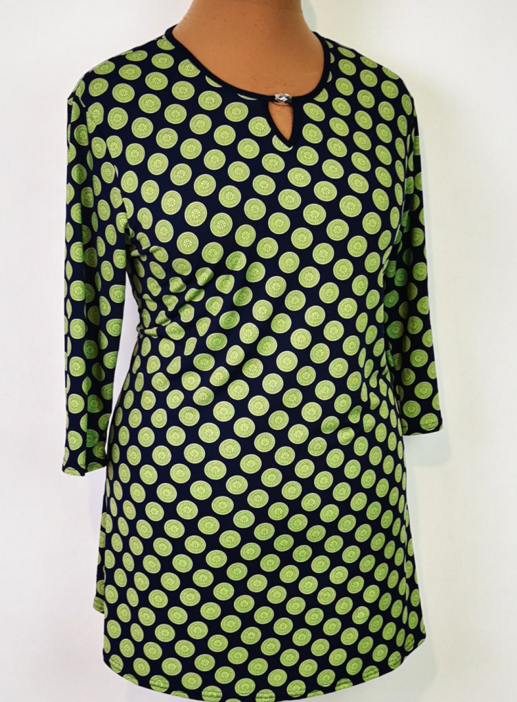 Kerek nyakú, 3/4-es ujjú, nyaknál cseppformájú kivágású, sötétkék alapon, világoszöld színű, pöttyös mintás, selymes anyagú tunika. 5-6 cm-t enged.