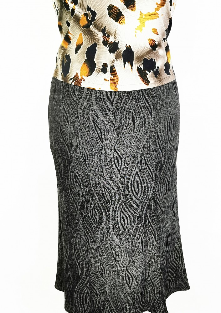 Sötétszürke-fekete mintás, 6 cikkes, lefelé bővülő szoknya 44-54
