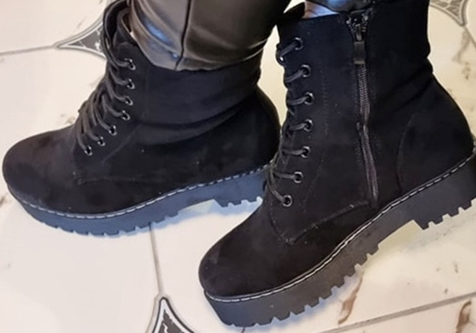 Fekete színű, szőrme béléses, fűzős, felső részén szintetikus velúr anyagú, cipáras, fűzós bokacsizma.