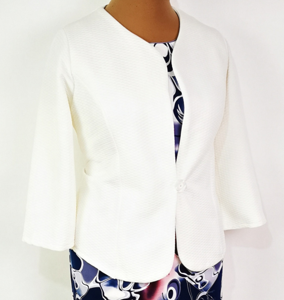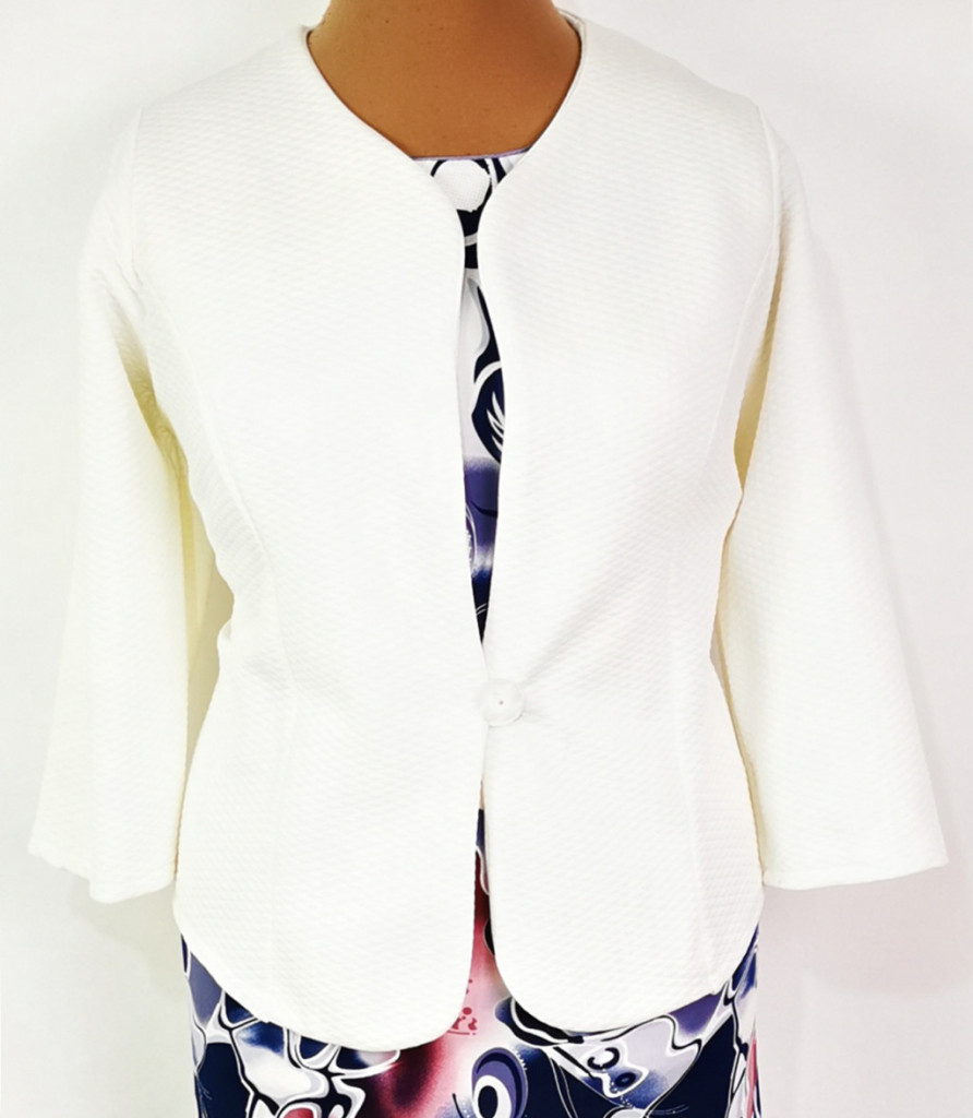 "V" nyakú, 1 gombos, 3/4 ujjú, anyagában mintás, alkalmi blézer. 2-3 cm-t enged.