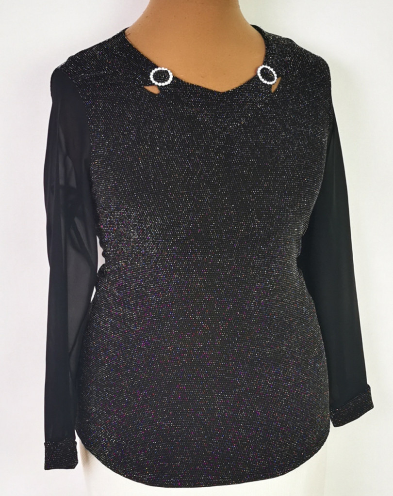"V" nyakú, 3/4-es tüllös ujjú, fekete színű, elől-hátul ezüstösen csillogó, nyaknál díszített alkalmi felső. 3-4 cm-t enged.