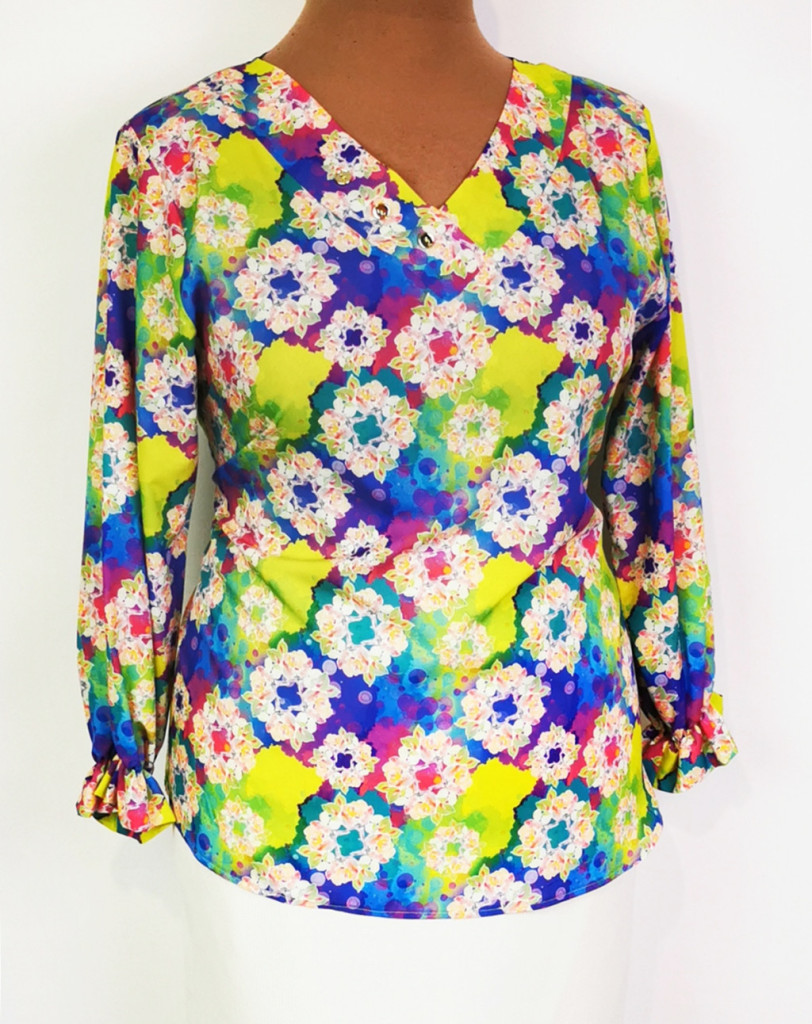 "V" nyakú, 3/4-es ujjú, színes virág mintás, nyaknál díszített felső 42-52
