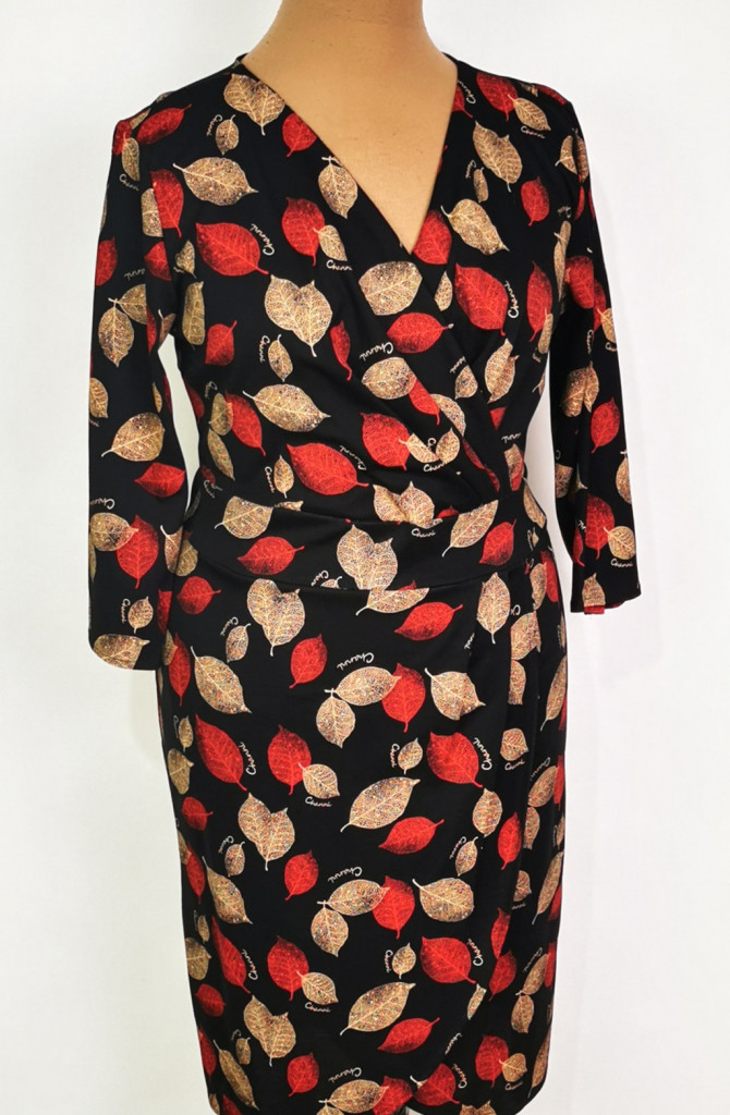 "V" nyakú, bordó színű, átlapolt hatású, enyhén csillogó mintás, deréknál díszcsatos, pamutos anyagú ruha. 3-4 cm-t enged.
