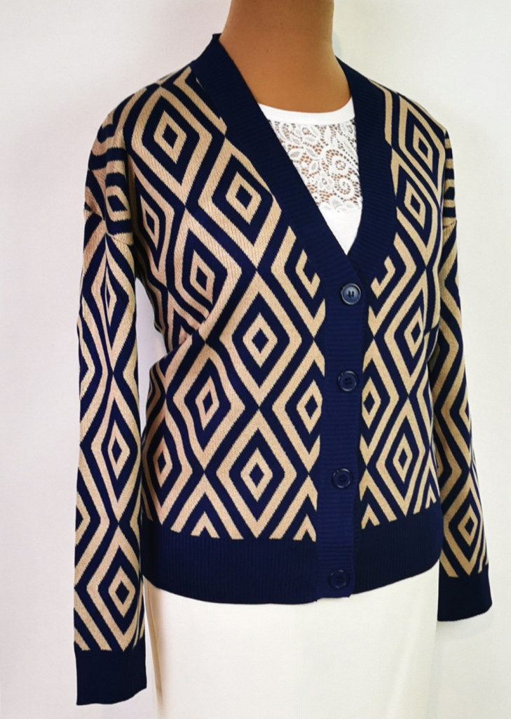 "V" nyakú, gépi kötött, rombusz mintával díszített kardigán. 6-7 cm-t enged.