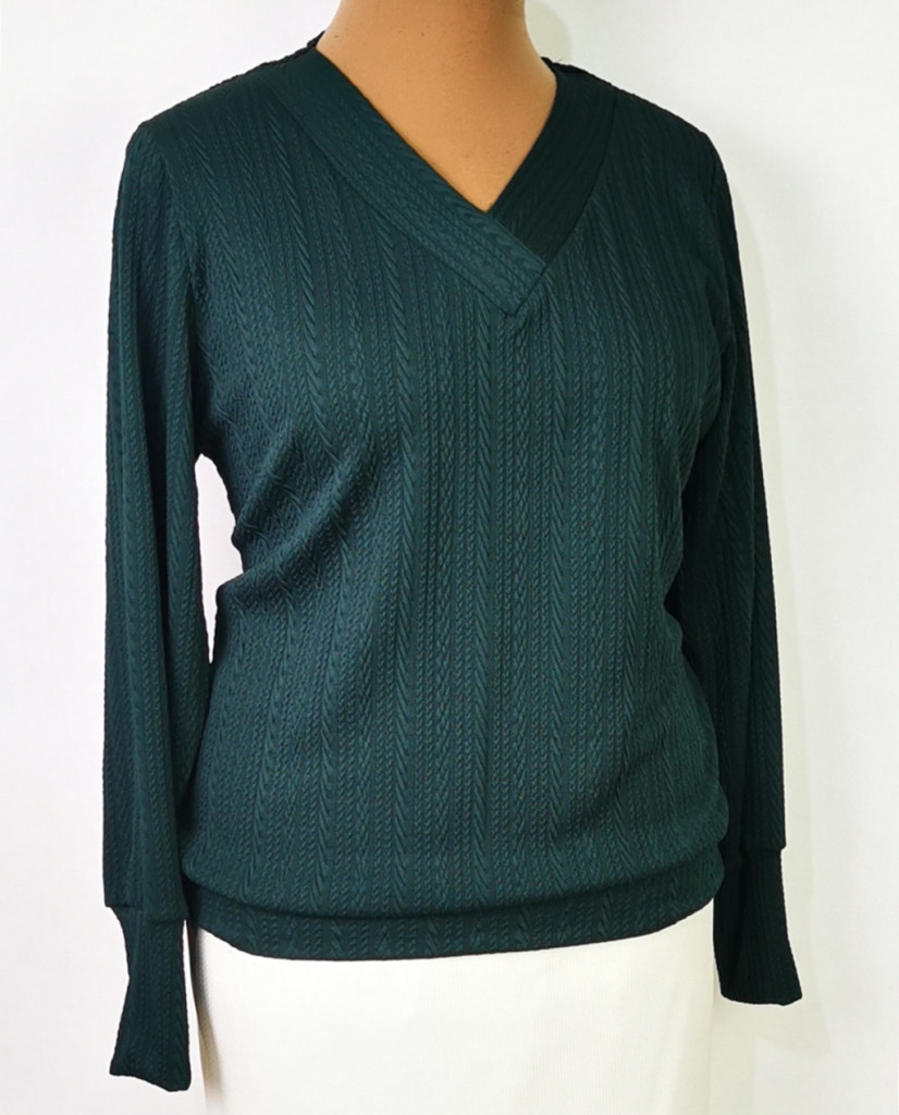 "V" nyakú, hosszú, sötétzöld színű, anyagában mintás, selymes anyagú alkalmi felső 42-52