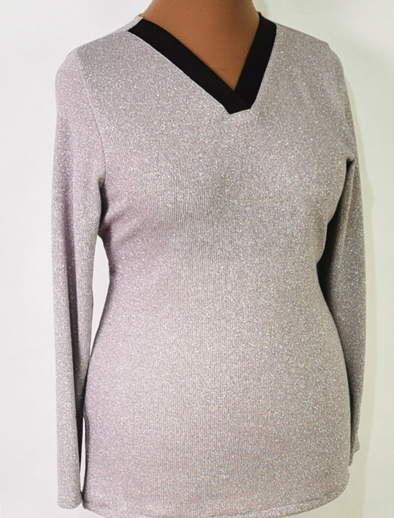 "V" nyakú, hosszú ujjú, pamutos anyagú, ezüstösen csillogó alkalmi felső. 6-7 cm-t enged.